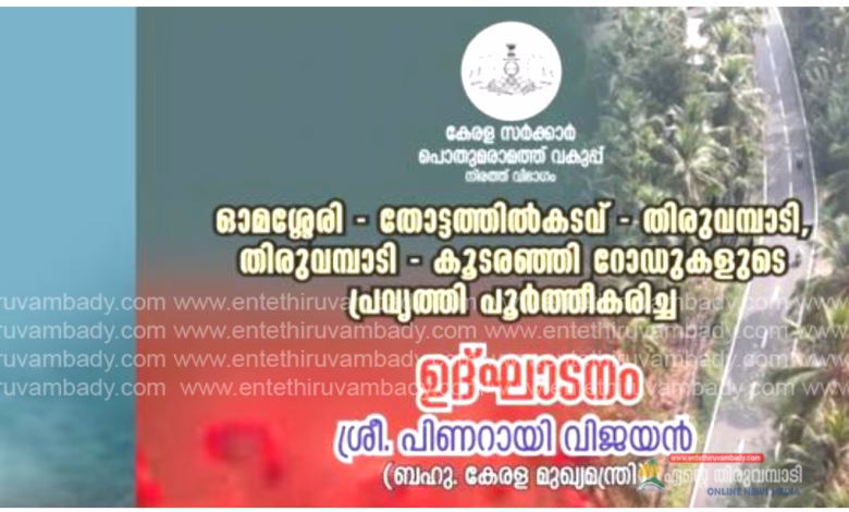 പ്രവൃത്തി പൂർത്തീകരിച്ച ഓമശ്ശേരി – തോട്ടത്തിൽകടവ് – തിരുവമ്പാടി, തിരുവമ്പാടി – കൂടരഞ്ഞി റോഡുകളുടെ ഉദ്ഘാടനം ഇന്ന്