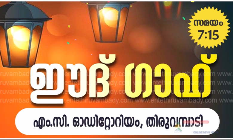 തിരുവമ്പാടി സംയുക്ത ഈദ് കമ്മിറ്റി നടത്തുന്ന ഈദ് ഗാഹ് എം.സി ഓഡിറ്റോറിയം അങ്കണത്തിൽ വച്ച് നടക്കും. നാളെ രാവിലെ 7:15 നമസ്കാരത്തിന് എ. അബൂബക്കർ മൗലവി നേതൃത്വം നൽകും. പെരുന്നാൾ നമസ്കാരത്തിന് ശേഷം യുദ്ധ വിരുദ്ധ പ്രതിജ്ഞയും നടക്കുമെന്ന് ഭാരവാഹികൾ അറിയിച്ചു.
