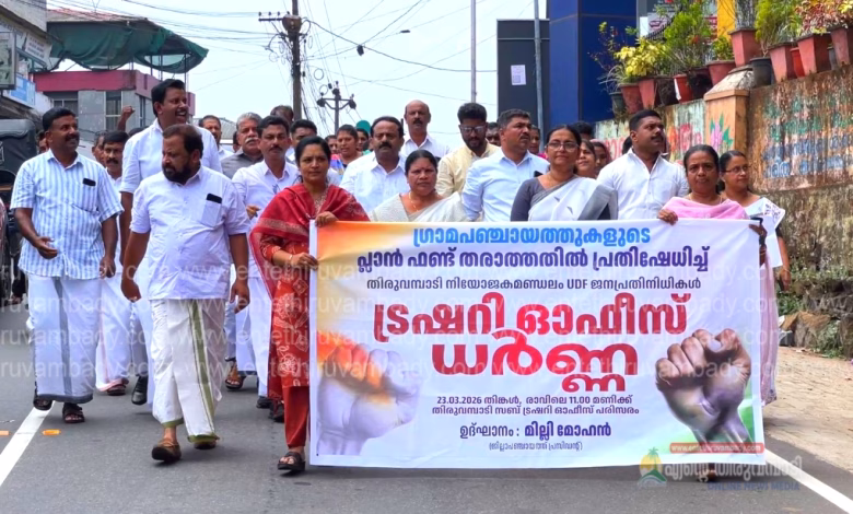 തിരുവമ്പാടി:സാമ്പത്തികവർഷത്തിൻ്റെ അവസാന ദിവസങ്ങളിൽ പോലും ത്രിതല പഞ്ചായത്തുകൾക്ക് നൽകേണ്ട മൂന്നാം ഗഡു പദ്ധതിവിഹിതം അനുവദിക്കാത്ത ഇടത്പക്ഷ സർക്കാരിൻ്റെ ജനദ്രോഹ നടപടിക്കെതിരെ തിരുവമ്പാടി നിയോജക മണ്ഡലത്തിലെ യു.ഡി.എഫ് ജനപ്രതിനിധികൾ തിരുവമ്പാടി സബ് ട്രഷറിക്ക് മുന്നിൽ ധർണ നടത്തി. ത്രിതല പഞ്ചായത്തുകളിലെ വികസന പദ്ധതി പ്രവർത്തനങ്ങൾ പൂർണമായും നിശ്ചലമായിരിക്കയാണെന്നും, എസ് സി – എസ് ടി വിഭാഗത്തിൻ്റെയും, ഭിന്നശേഷി വിഭാഗത്തിൽപ്പെട്ടവരുടെപ്പോലും പദ്ധതി പ്രവർത്തനങ്ങളടക്കം പൂർണമായും തടസ്സപ്പെട്ടിരിക്കുന്ന സാഹചര്യമാണുള്ളതെന്നും ധർണ ഉൽഘാടനം ചെയ്യവേ കോഴിക്കോട് ജില്ലാ പഞ്ചായത്ത് പ്രസിഡണ്ട് മില്ലി മോഹൻ പറഞ്ഞു.