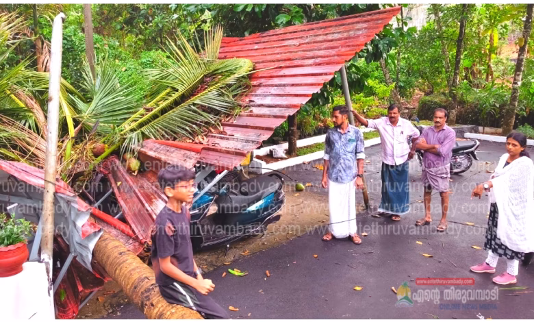 തിരുവമ്പാടി: ഇന്ന് ഉച്ചയ്ക്ക് ശേഷം ഉണ്ടായ കനത്ത വേനൽമഴയിലും കാറ്റിലും പാമ്പിഴഞ്ഞപാറയിൽ സ്വകാര്യ വ്യക്തിയുടെ പറമ്പിലെ തെങ്ങ് മുറിഞ്ഞു വീണ് സലീം കൊല്ലനാരിയുടെ കിണറിന്റെ ആൾമറ തകർന്നു വീഴുകയും വീടിനോടു ചേർന്നുളള പോർച്ചും, പോർച്ചിൽ നിർത്തിയിട്ട വാഹനങ്ങൾക്കും സാരമായ കേടുപാടുകൾ സംഭവിക്കുകയും ചെയ്തു. വാർഡു മെമ്പർ പ്രീതി രാജീവ്, വാർഡ് വികസന സമിതി കൺവീനർ മുഹമ്മദ് അസ്ലം,മുഹമ്മദ് വിശാൽ, ഷാജഹാൻ എന്നിവരുടെ നേതൃത്വത്തിൽ സംഭവ സ്ഥലം സന്ദർശിച്ച് സ്ഥിതികൾ വിലയിരുത്തി.കനത്ത നാശനഷ്ടമാണ് സംഭവിച്ചിട്ടുള്ളത്.