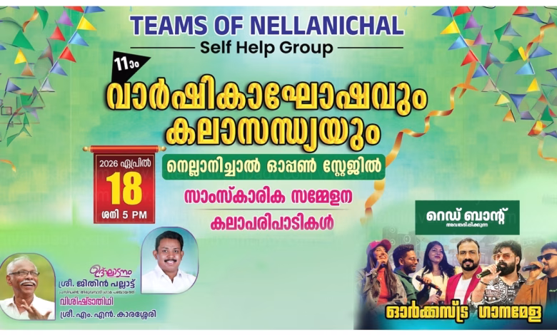 തിരുവമ്പാടി: നെല്ലാനിച്ചാൽ ആസ്ഥാനമായി പ്രവർത്തിക്കുന്ന ടീംസ് ഓഫ് നെല്ലാനിച്ചാൽ സെൽഫ് ഹെല്പ് ഗ്രൂപ്പിന്റെ പതിനൊന്നാം വാർഷികത്തോടനുബന്ധിച്ച് നടക്കുന്ന പൊതുസമ്മേളനവും കലാസന്ധ്യയും ഇന്ന് നെല്ലാനിച്ചാലിൽ നടക്കും.