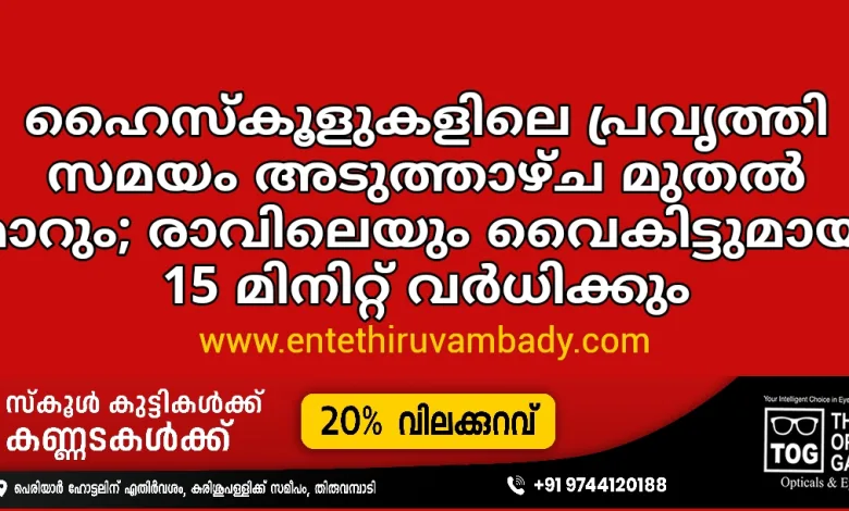 ഹൈസ്കൂളുകളിലെ പ്രവൃത്തി സമയം അടുത്താഴ്ച മുതൽ മാറും; രാവിലെയും വൈകിട്ടുമായി 15 മിനിറ്റ് വർധിക്കും
