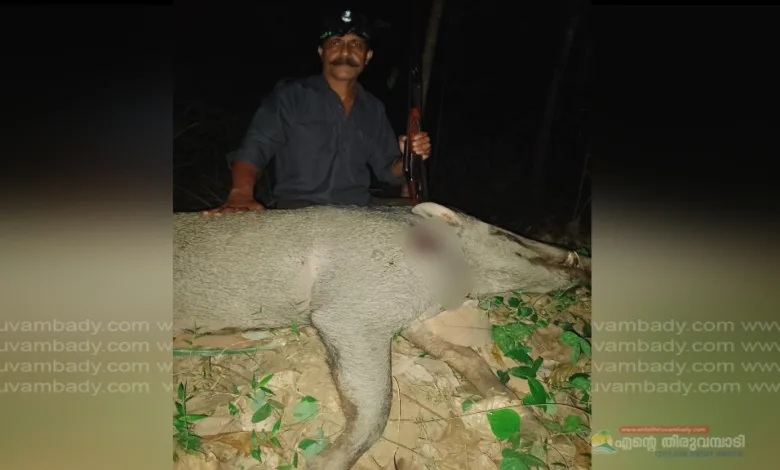 കോടഞ്ചേരി : കോടഞ്ചേരി ഗ്രാമപഞ്ചായത്തിലെ നാരങ്ങാത്തോട് ഭാഗത്തുനിന്നും 150 കിലോ തൂക്കം വരുന്ന ഒറ്റയാൻ കാട്ടുപന്നിയെ, എം പാനൽ ഷൂട്ടർ ആയ പുല്ലൂരാംപാറ ഇടക്കര വിൽസൺ വെടിവെച്ച് കൊന്നു. കോടഞ്ചേരി ഗ്രാമപഞ്ചായത്ത് പ്രസിഡണ്ട് അലക്സ് ചെമ്പകശ്ശേരിയുടെ നിർദ്ദേശാനുസരണം ജഡം, നിയമാനുസൃതം മറവ് ചെയ്തു.