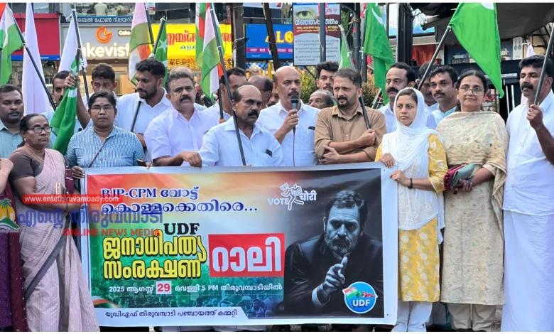തിരുവമ്പാടി :രാജ്യം ഒന്നടങ്കം ചർച്ച ചെയ്തുകൊണ്ടിരിക്കുന്ന വോട്ട് കൊള്ളയെ തെളിവ് സഹിതം പുറത്തുകൊണ്ടുവന്ന രാഹുൽ ഗാന്ധിക്ക്, ഐക്യദാർഢ്യം പ്രഖ്യാപിച്ചുകൊണ്ട് തിരുവമ്പാടി പഞ്ചായത്ത് യുഡിഎഫ് കമ്മിറ്റി ഐക്യദാർഢ്യ റാലിയും പൊതുസമ്മേളനവും സംഘടിപ്പിച്ചു. റാലിയും പൊതുസമ്മേളനവും തിരുവമ്പാടി നിയോജകമണ്ഡലം യുഡിഎഫ് ചെയർമാൻ സി. കെ കാസിം ഉദ്ഘാടനം നിർവഹിച്ചു.